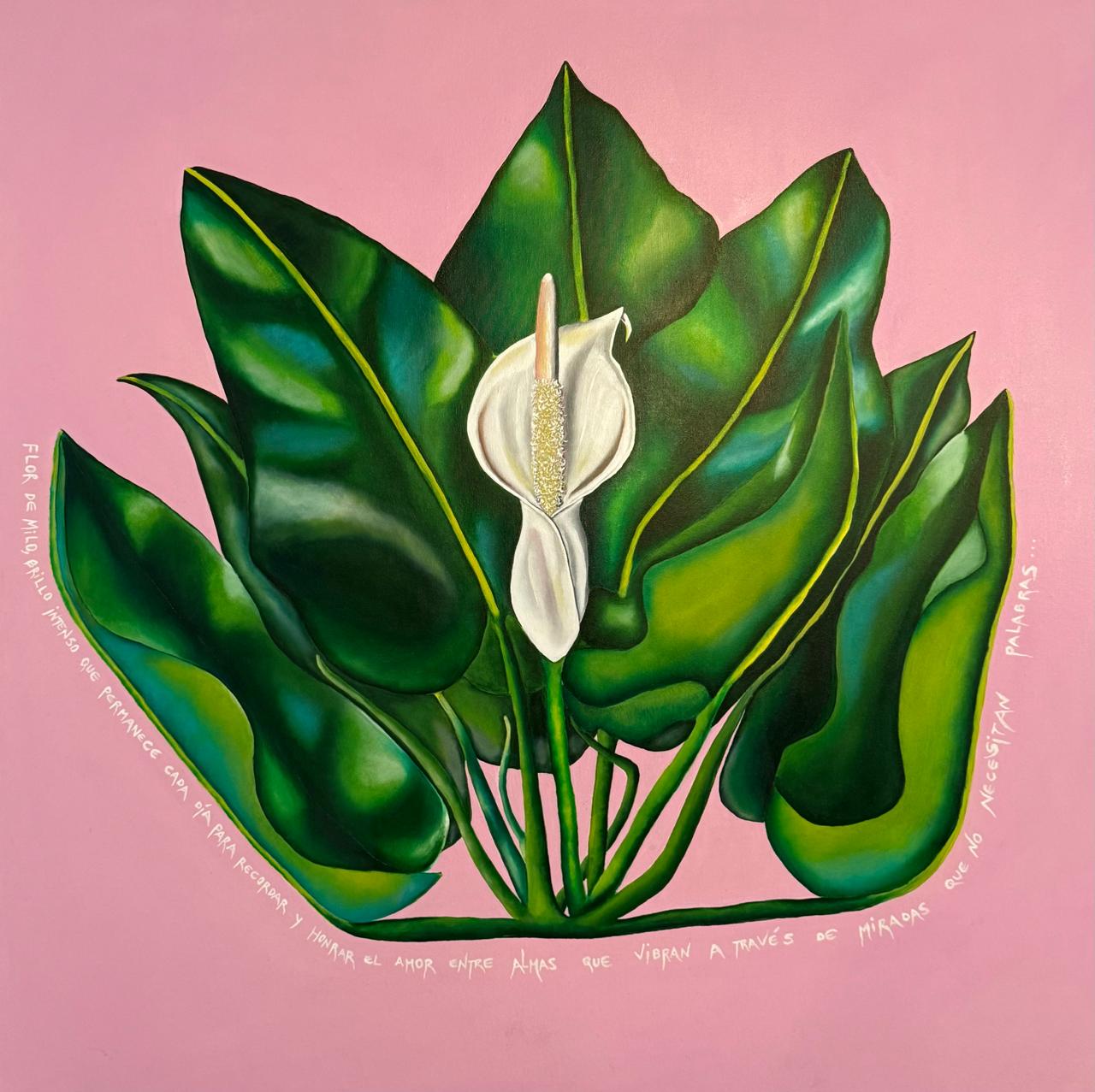 La flor central, erguida y luminosa, actúa como núcleo de memoria, mientras las hojas que la rodean configuran un espacio de resguardo, casi como un gesto de abrazo. La composición no describe una ausencia, sino una continuidad: una forma de amor que persiste más allá del tiempo y del cuerpo.